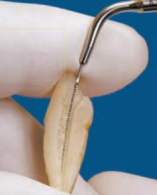 Рабочая часть насадки расположена на её кончике, это последние 2 – 3 мм. Кончик насадки (рабочую часть насадки), следует располагать соосно продольной оси зуба. Насадкой, не погружая её сразу в десневую борозду, необходимо пройти по периметру зуба, убирая доступные для обзора наддесневые (или поддесневые) отложения, без чрезмерного латерального давления. Начинайте работу с лицевой стороны зуба перемещаясь к мезиальному или дистальному краю.