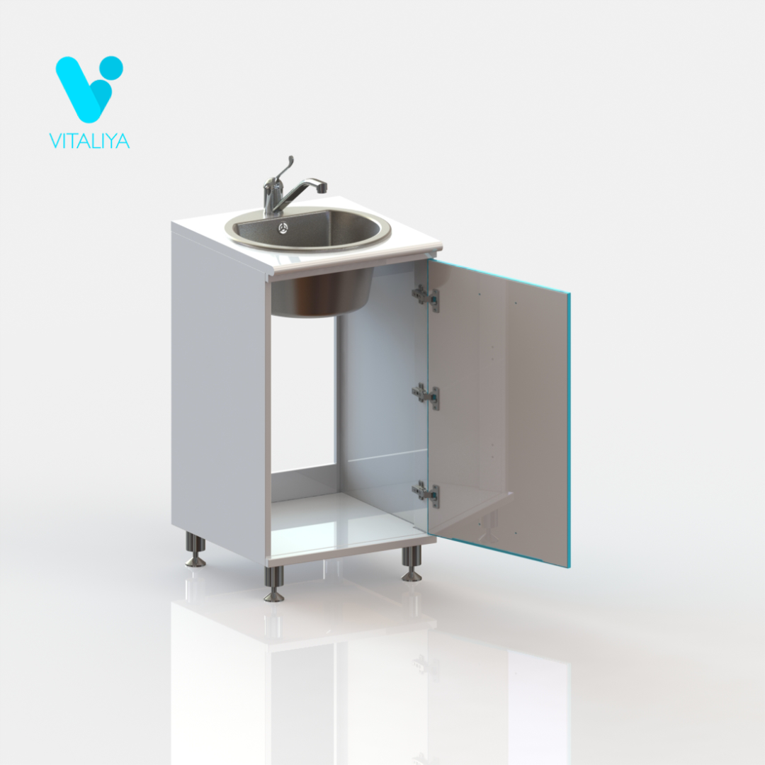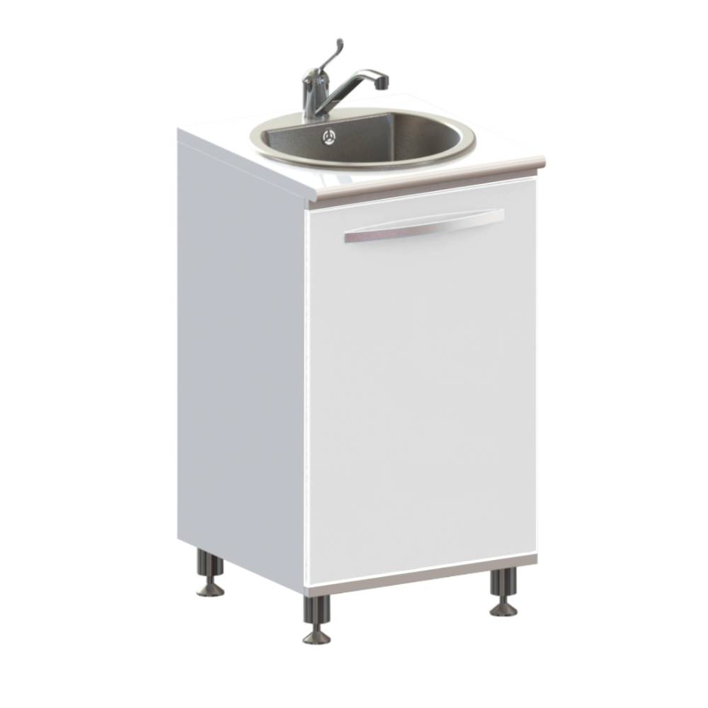 Тумба металлическая цельносварная, выполнена из листового металла толщиной 1 мм и окрашена полимерно-порошковой краской. Дверь установлена на петли с механизмом плавного закрывания, производства компании HETTICH, Германия. Фасад двери укомплектован ручкой-скобой из нержавеющей стали с межцентровым расстоянием 320 мм, цвет брашированный сатиновый никель. Задняя стенка тумбы имеет технологические вырезы под коммуникации. Тумба изготовлена в варианте на регулируемых хромированных опорах высотой 100 мм. Комплектуется раковиной из нержавеющей стали, производства компании OULIN, Германия, сифоном и локтевым смесителем.