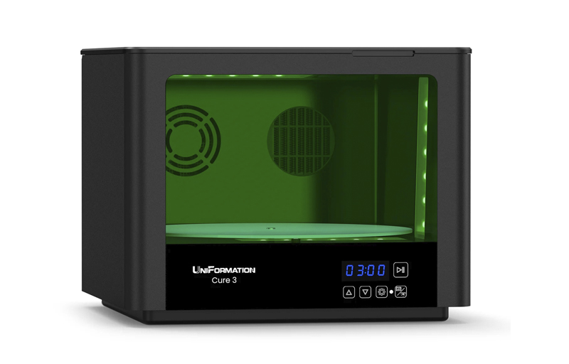 Просторное пространство для отверждения: станция отверждения полимеров UniFormation Cure3 имеет просторную зону отверждения размером 282 мм (Д) x 162 мм (В), позволяющую размещать как одну большую модель, так и несколько моделей меньшего размера в одной партии для постобработки. Она совместима с GK3, GK3 Pro и большинством LCD/DLP/SLA 3D-принтеров с размером печати до 10,3 дюйма.