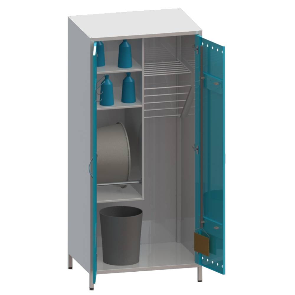Шкаф двухстворчатый на ножках, выполненных цельно с корпусом шкафа. Оснащается 2-я дверками. Предназначен для размещения уборочного инвентаря. Внутри шкафа три полки для инвентаря держатели для швабр, держатели для ветоши, полка для размещения таза и ведра.